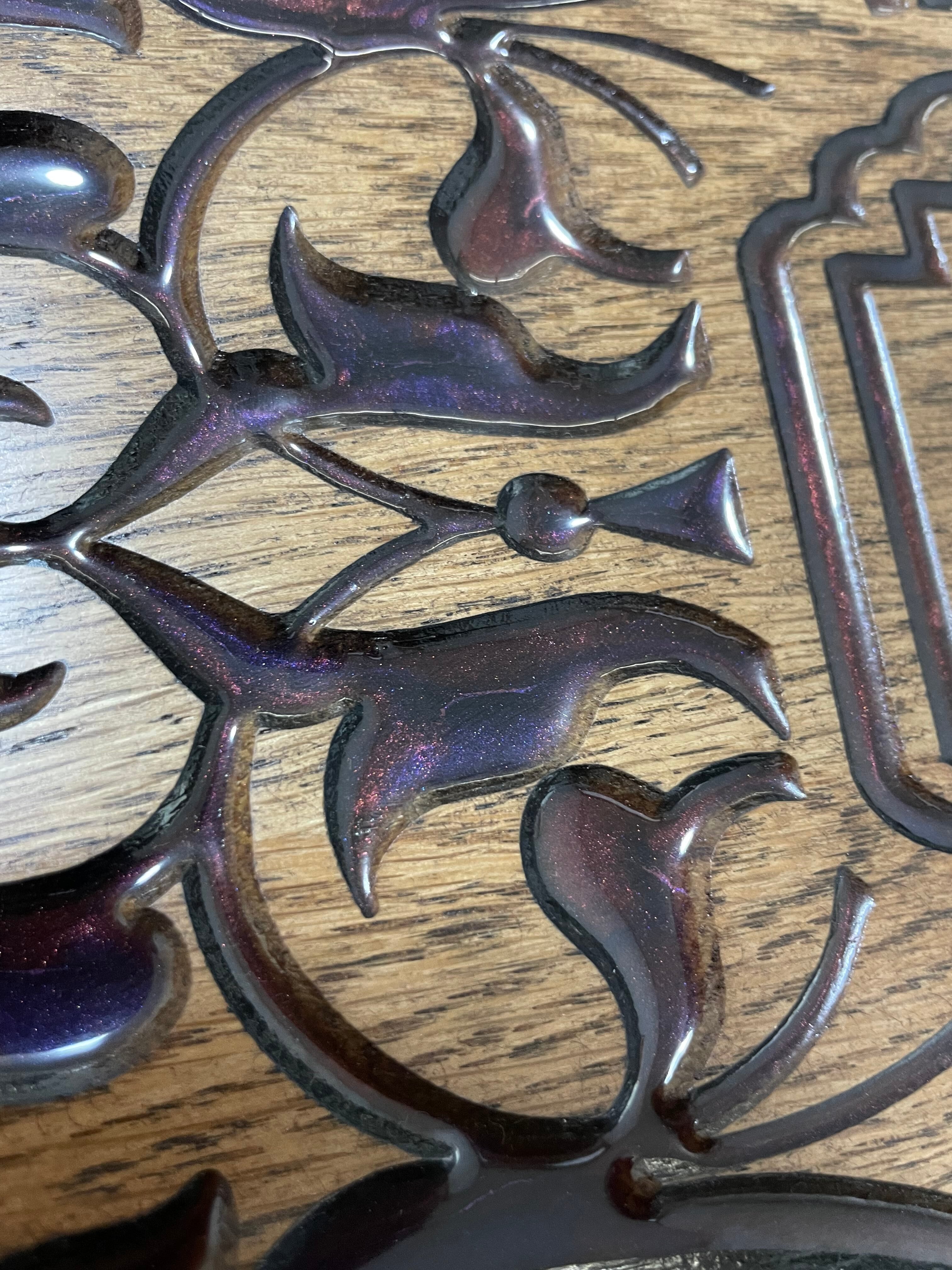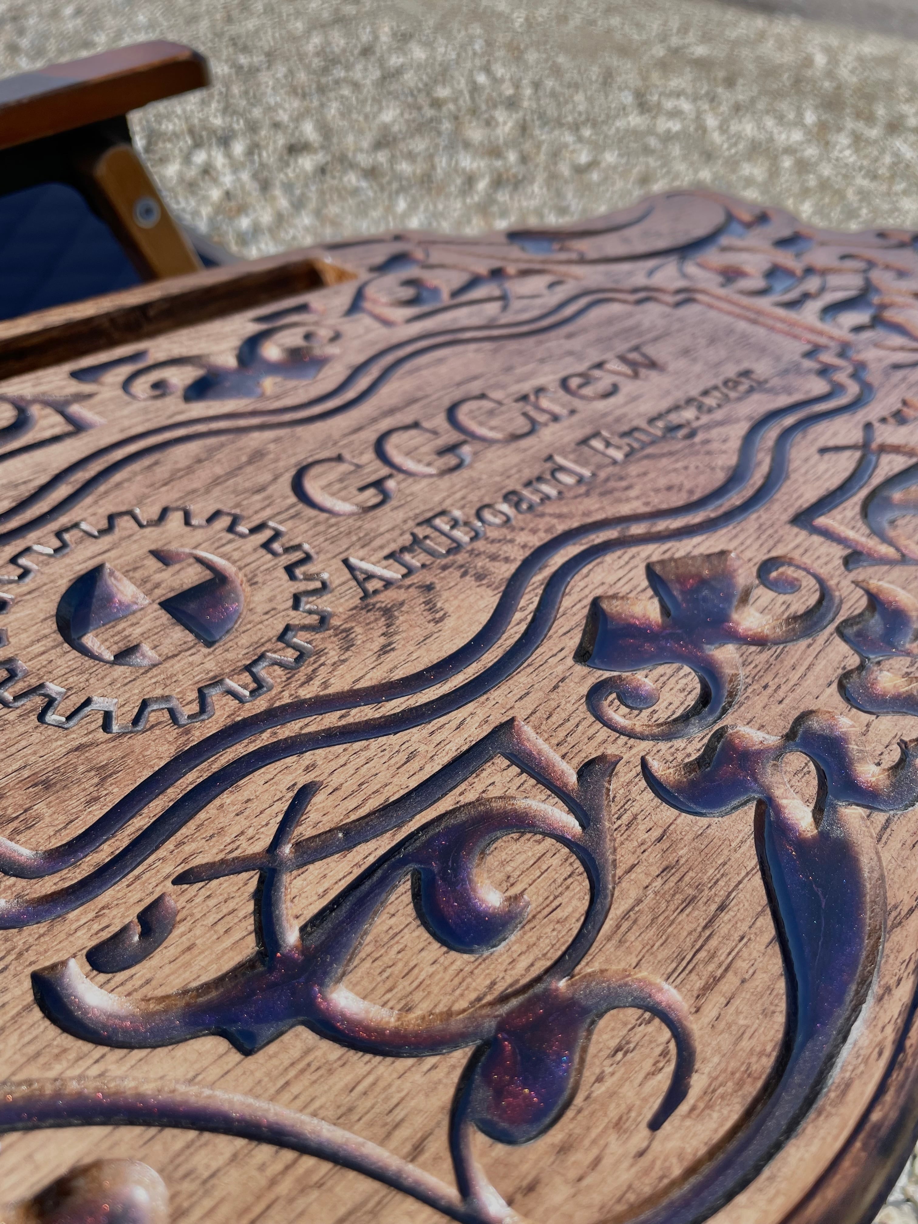 さらに、天板の彫刻部分には樹脂を流し込んで仕上げており、カラーは数種類ご用意。